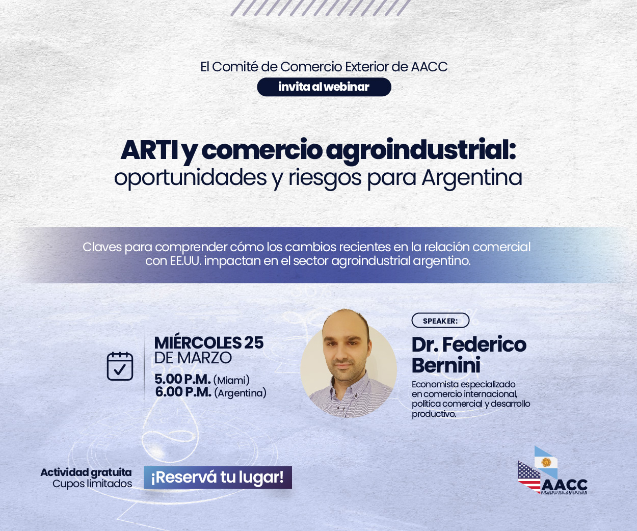 La Cámara de Comercio Argentino Americana de la Florida invita a su comunidad a un webinar estratégico: "ARTI y comercio agroindustrial: oportunidades y riesgos para Argentina". Un encuentro clave para comprender cómo los cambios recientes en la relación comercial con Estados Unidos impactan en el sector agroindustrial y qué escenarios se abren para 2026. Analizaremos: […]
